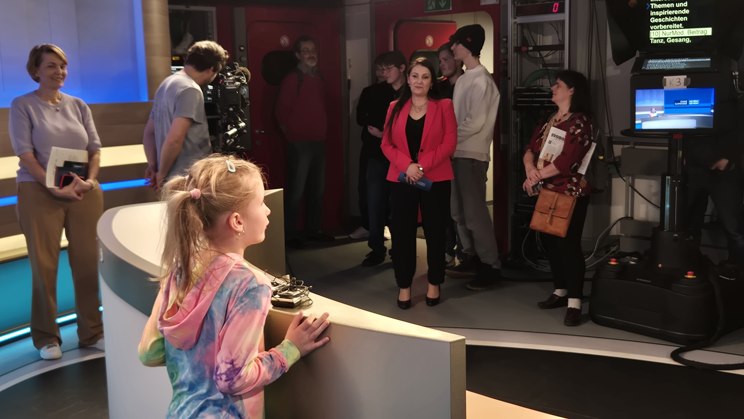 Nach der Begrüßung folgte eine Führung durch die Räumlichkeiten, die den Prozess der Entstehung einzelner Sendungen und Reportagen sichtbar machte. Die Gruppe konnte sowohl das Fernseh‑ als auch das Radiostudio besichtigen und eine Live‑Sendung von Radio Burgenland mitverfolgen. Die Führung umfasste auch den Schnittraum, in dem gerade ein Beitrag über den Repräsentations‑ und Maturaball der Wiener Tschechen und Slowaken entstand. Die Redakteurin der tschechischen Redaktion, Martina Pfeffer, erklärte, wie der Schnitt der Beiträge und die Erstellung der finalen Sendung ablaufen, sodass die Teilnehmenden die Entstehung der Reportage „aus erster Hand“ beobachten konnten.