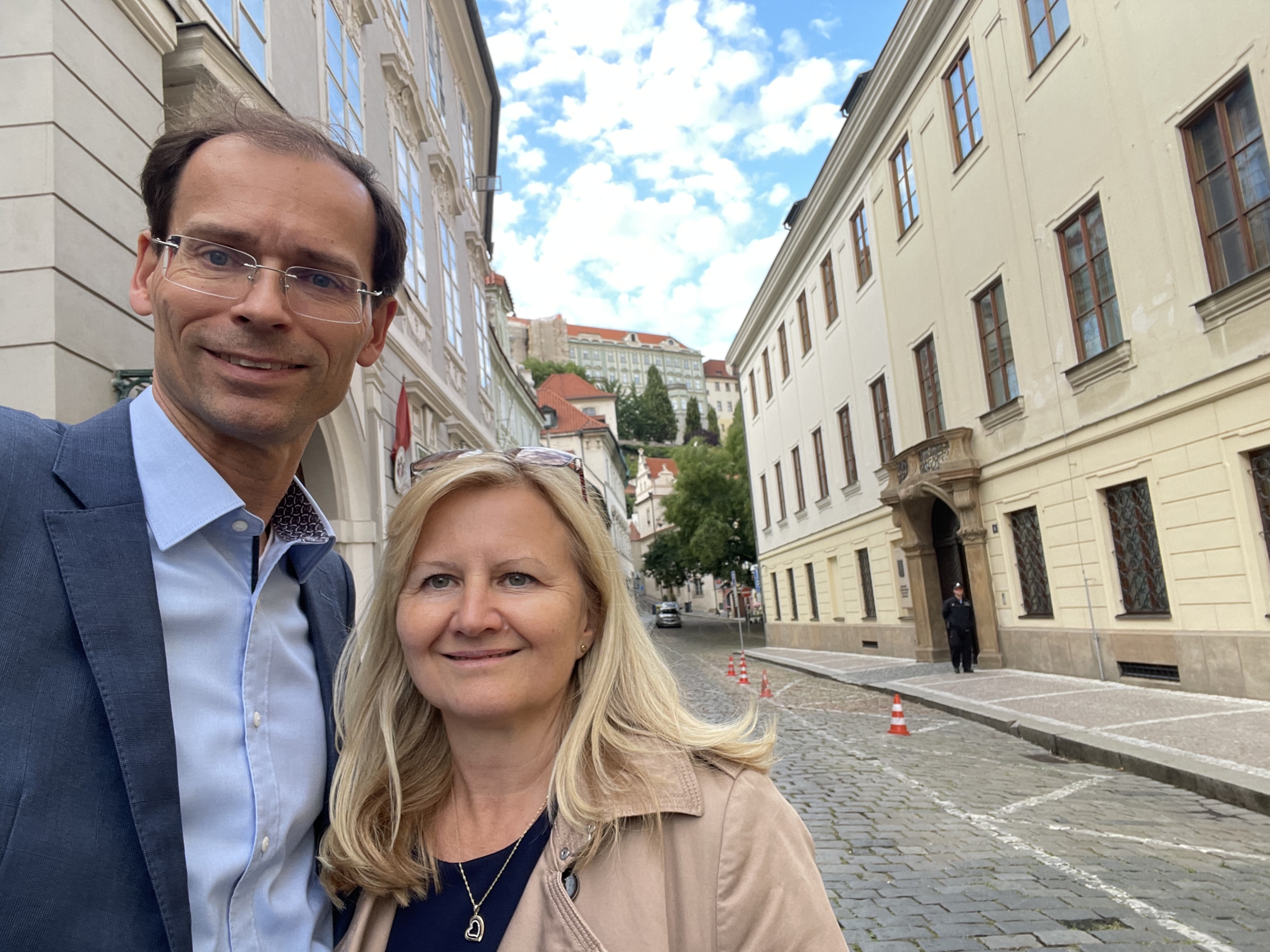 Manželé Canovi před budovou Poslanecké sněmovny v Praze