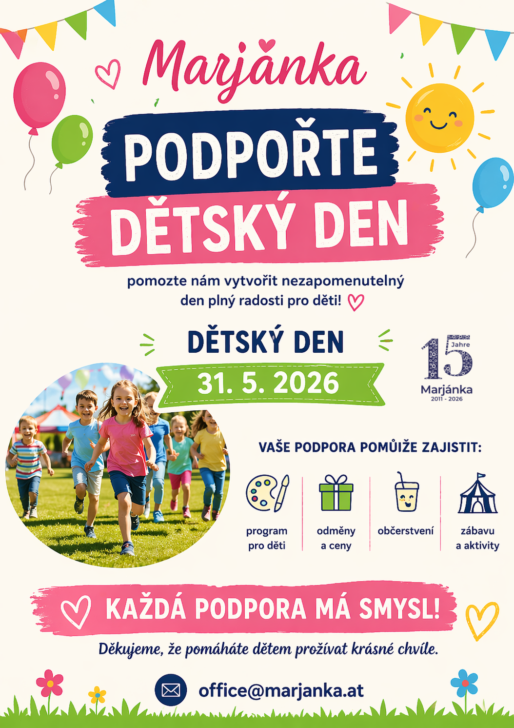 Podpořte Dětský den 31. května 2026, konaného ve vídeňském parku Prátr a pomozte vytvořit den plný her, tvoření a radosti pro děti a rodiny — akce se koná v rámci jubilea založení Marjánky 2011.