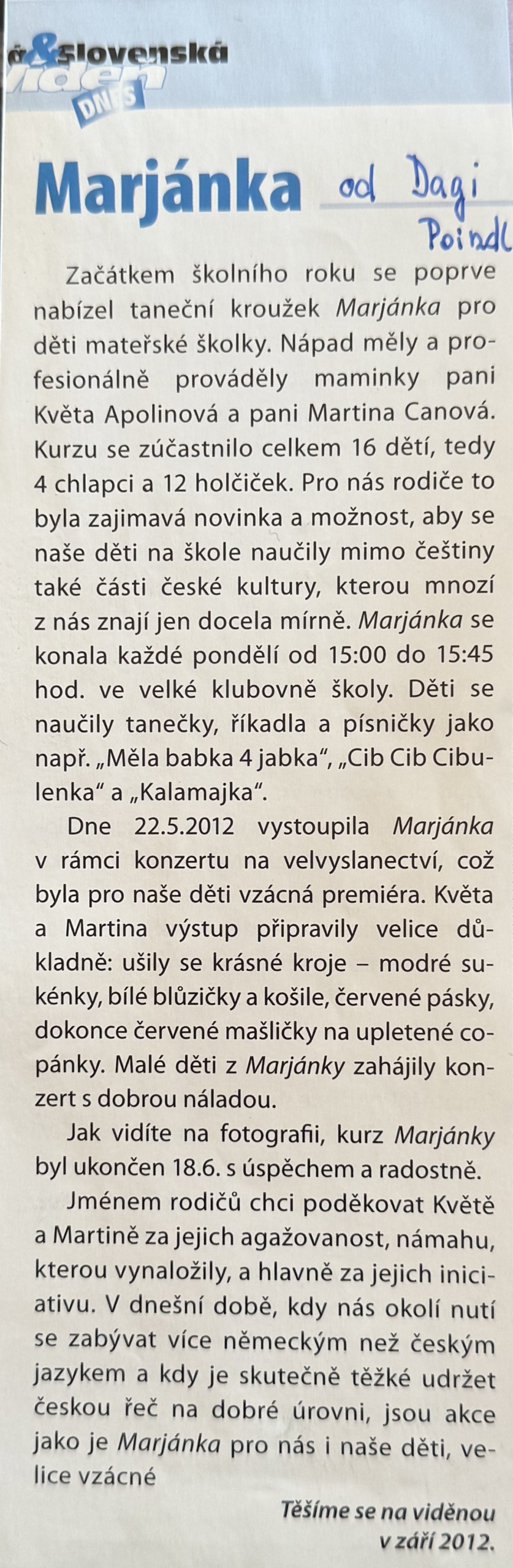 Děti, které u nás kdysi s nadšením začínaly, jsou dnes už dospělé – a je krásné se s nimi po letech potkávat, prohodit pár slov a zavzpomínat. Ať už ve víru vídeňských ulic, nebo na menšinovém bále, vždy v nich vidíme kousek někdejší Marjánky a jejich začátků. A kdo ví – třeba až jednou budou sami rodiči, vzpomenou si na tyto společné chvíle a přivedou do Marjánky i své děti. Tak se naplňuje a znovu začíná ten nádherný koloběh života.