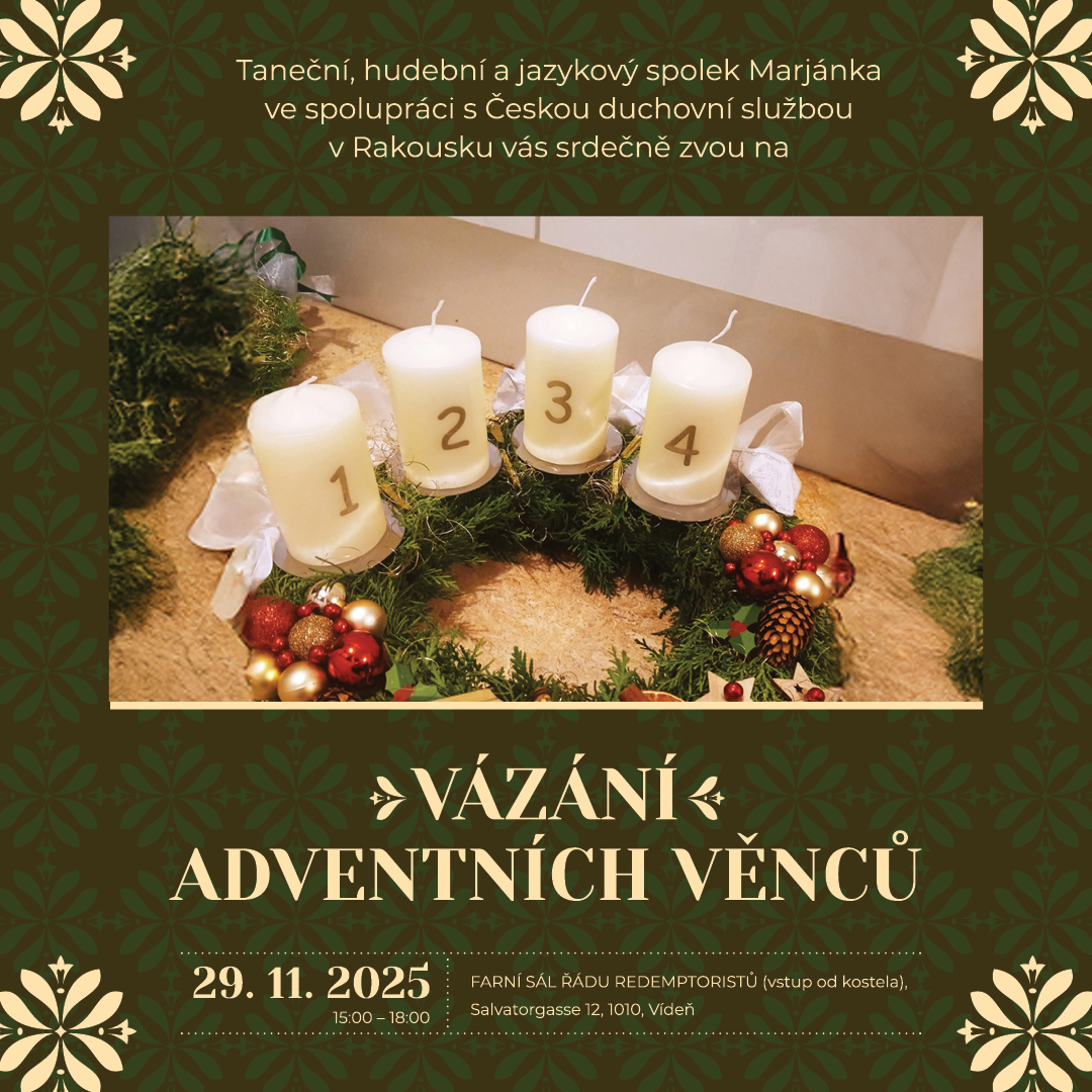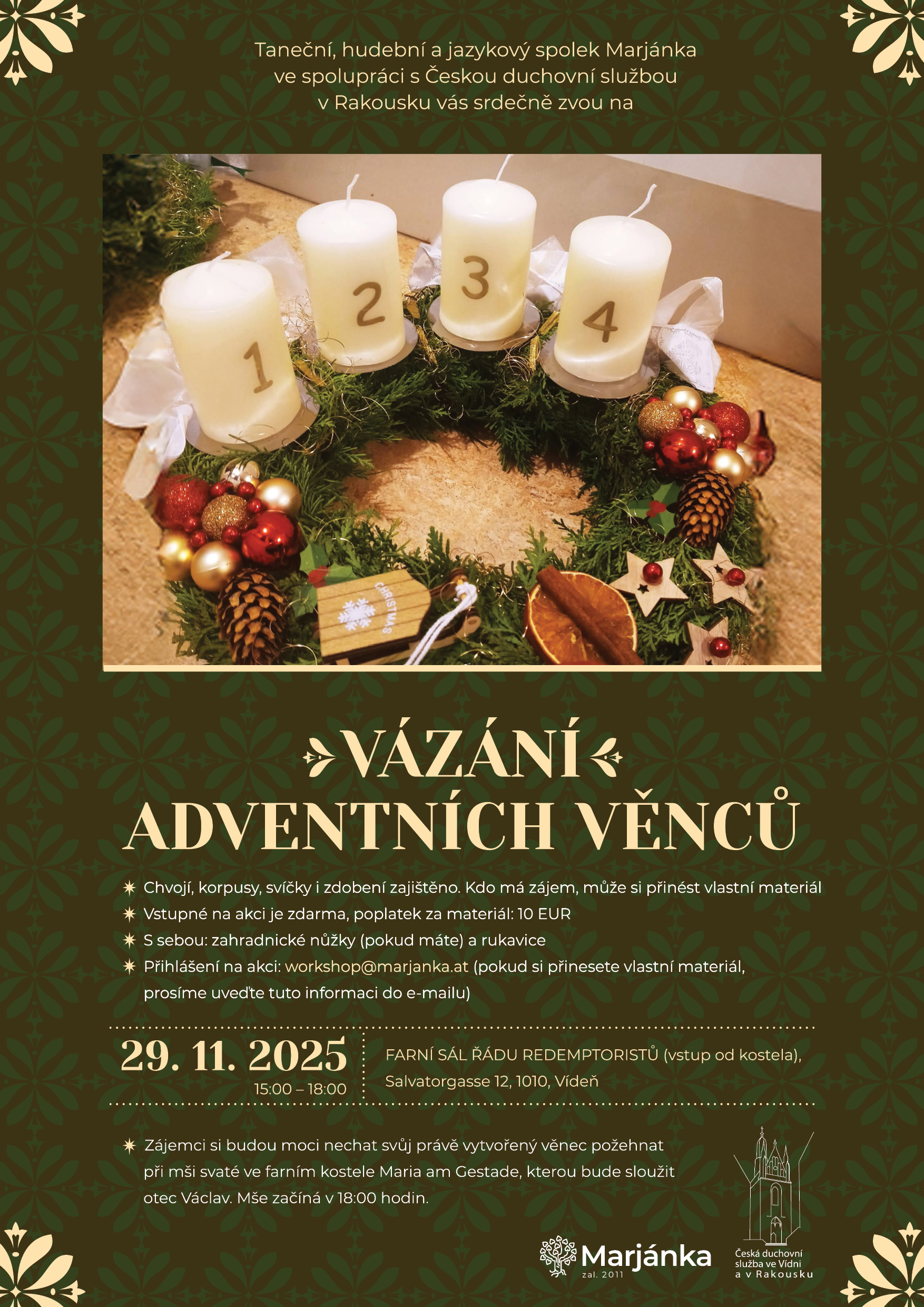 Srdečně vás zveme na tradiční tvoření adventních věnců na faře kostela Maria am Gestade pod vedením naší členky Lenky Kmeťové a její maminky Alenky. Závazné přihlášky prosíme do 20.11.2025 na mail: office@marjanka.at (pokud si přinesete vlastní materiál, uveďte tuto informaci do e-mailu).