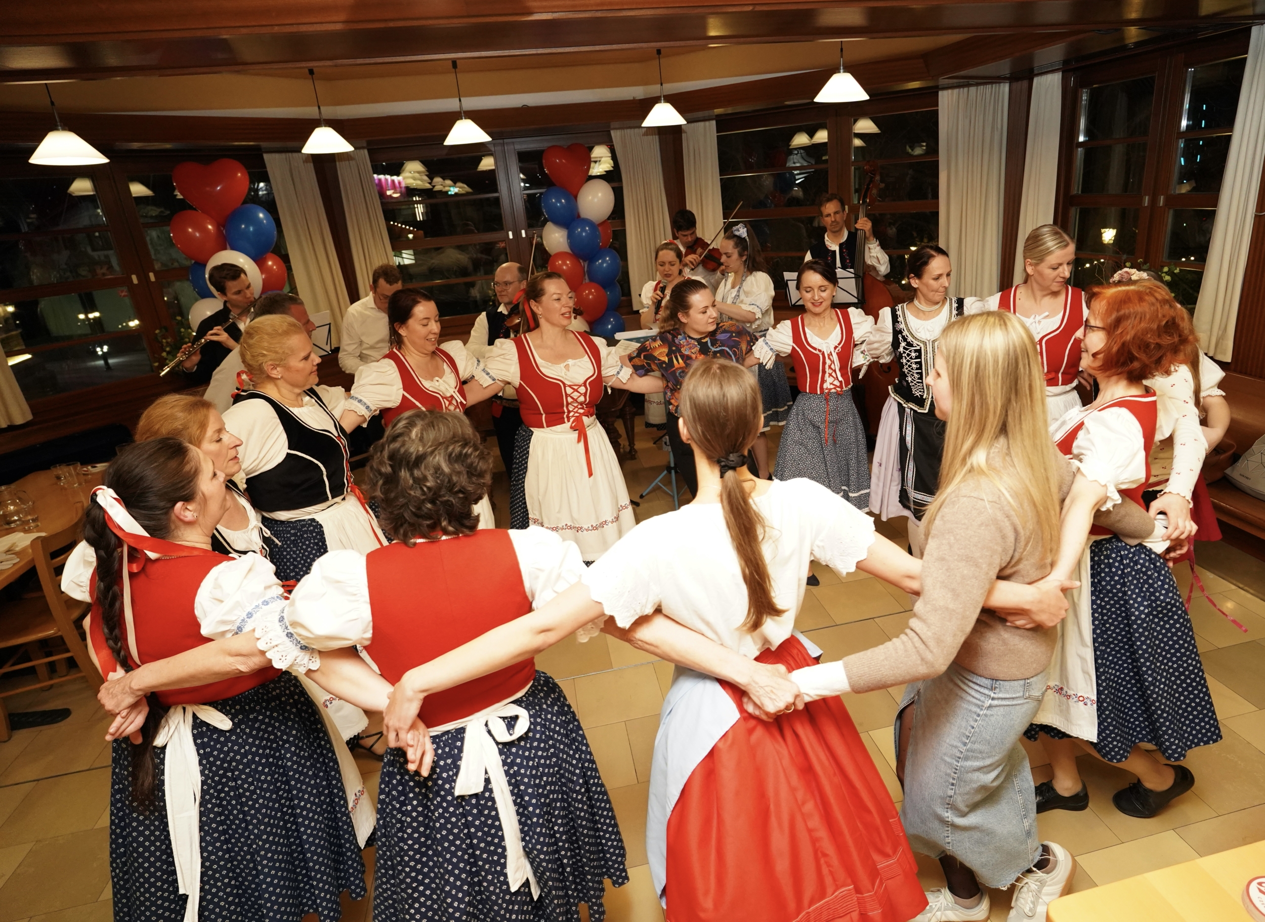 Podvečer 23. marca sa reštaurácia Schweizerhaus začala zapĺňať českými a slovenskými krajanmi, z ktorých mnohí dorazili v krásnych krojoch, ktoré rozžiarili sálu Gloriette. Spolu sa zišlo 120 hostí, čo nás naozaj potešilo. O 18:30 všetkých privítali moderátorky – podpredsedníčka spolku Monika Caudr a členka spolku Michaela Jana Löff. Striedali sa v slovenčine a nemčine a hosťom priblížili nielen činnosť spolku a život menšiny, ale aj príbehy ľudí, ktorí ju tvoria. Zároveň predstavili členov cimbalovej muziky a aj to, ako sa v priebehu rokov menilo jej zloženie.